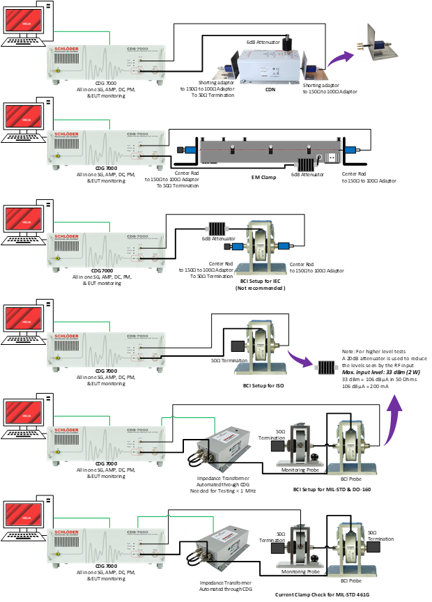 The CDG 7000 Conducted Immunity Test System is an advanced solution for evaluating immunity to conducted disturbances induced by high-frequency fields, covering the range of 10 kHz to 400 MHz. Designed in compliance with IEC/EN 61000-4-6, IEC 61326-3-2, NAMUR, and ISO 11452-4 (BCI tests), this compact system integrates all essential modules into one affordable unit, eliminating the need for multiple instruments.