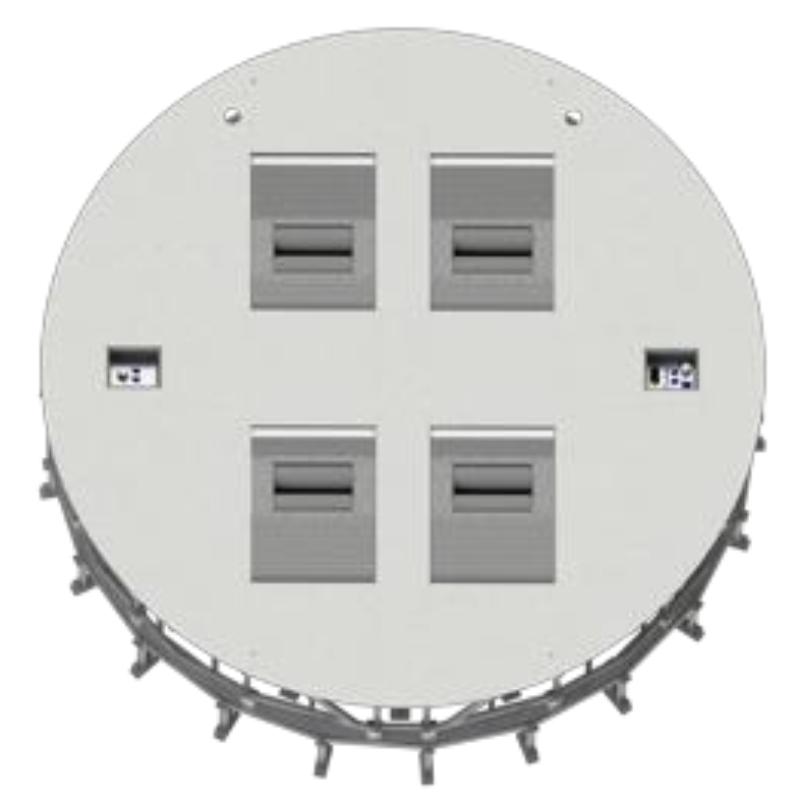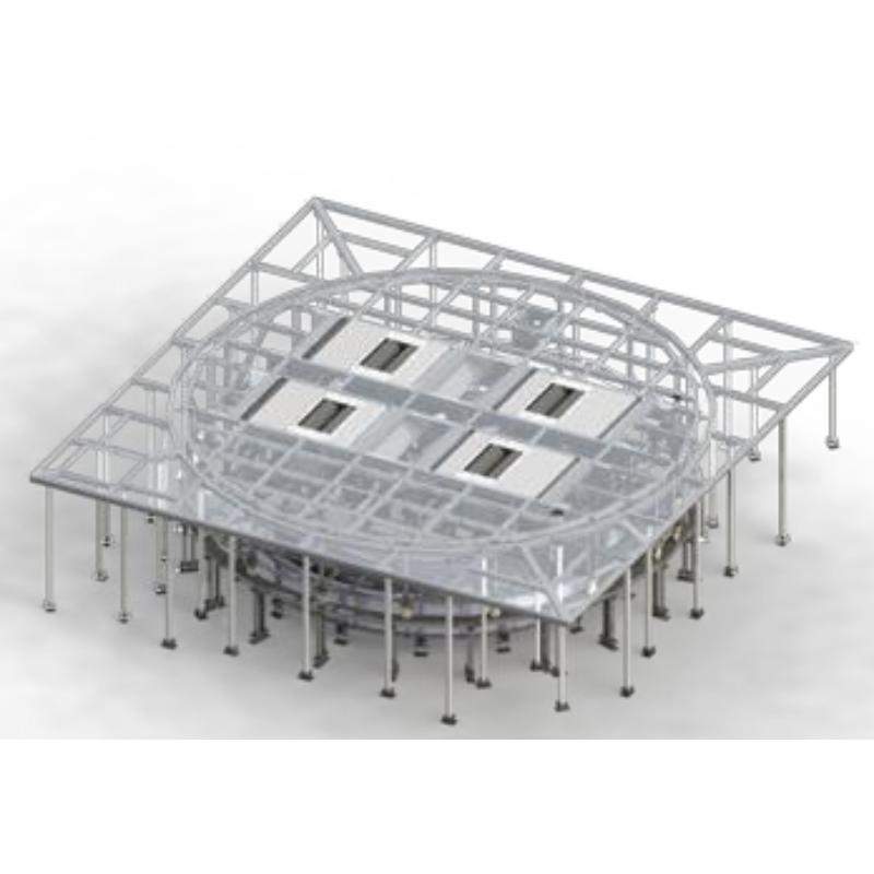 The turntable is designed for flush-mounted installation in electromagnetic absorption chambers. It supports rotational speeds from 0.1 to 0.5 rpm with high precision (+/- 0.5°) and features an acceleration/deceleration ramp for smooth start and stop, ensuring vehicle safety. The integrated emergency switches, limit switches, and positioning sensors further enhance operational safety.