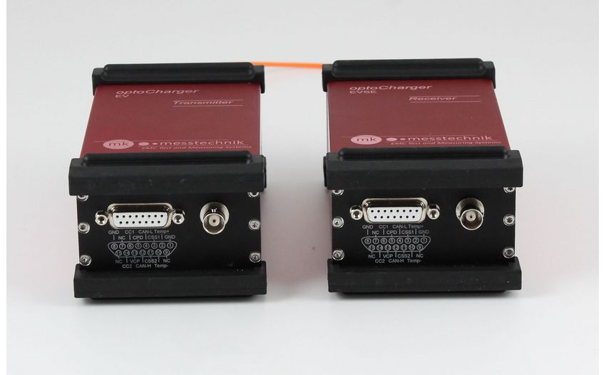 With a 20 m multimode optical fiber link (62.5/125 µm), the optoCharger transmits Control Pilot (PLC), CAN, and auxiliary signals such as temperature monitoring and connector lock control. This makes it an ideal choice for EMC testing, research, and validation in both laboratory and on-site environments.